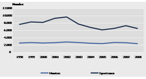 As is shown in Figure 1 and Table 11, the number of hunters has been stable for the past ten years. In 2008, 2.388 persons took out a hunter licence. The number of sportsmen was the highest in 2002 where 9.686 persons held this type of licence. Since then, the number of sportsmen has declined and in 2008, 6.539 persons had this type of licence. The decline is primarily due to quota-free reindeer hunt in many parts of the country in recent years.