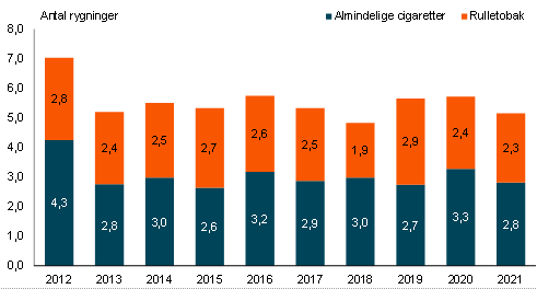 Hvis man antager, at hver rygning indeholder 1 gram tobak, er der således i 2021 indført nok til at alle personer i Grønland, fyldt 15 år, kan ryge 5,2 smøger pr. dag hele året, jf. figur 1. Det er et fald på 0,6 smøg i forhold til året før, svarende til 9,9 pct.