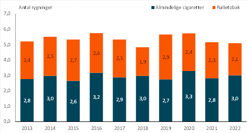 Hvis man antager, at hver rygning indeholder 1 gram tobak, er der således i 2022 indført nok til at alle personer i Grønland, fyldt 15 år, kan ryge 5,1 smøger pr. dag hele året, jf. figur 1. Det er et fald på 0,1 smøg i forhold til året før, svarende til 0,9 pct.