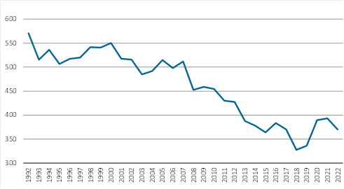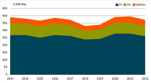 Der blev i 2022 indført og produceret 370 tusind liter ren alkohol i drikkevarer, jf. figur 1. I forhold til året før, faldt tilførslen af ren alkohol således med 23 tusind liter, eller 5,9 pct. I forhold til tilførslen af ren alkohol i 1992, er der tale om et fald på 201 tusind liter. Indførsel og produktion af alkohol er således faldet med 35,2 pct. i løbet af de sidste 30 år.