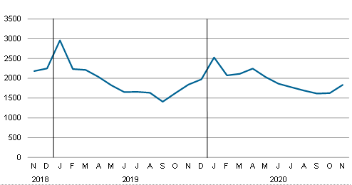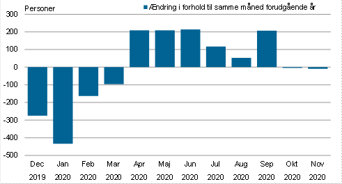 I november måned 2020 blev 1.833 personer i alt registreret som arbejdssøgende. Dette er et samlet fald på 10 arbejdssøgende personer i forhold til samme måned året før.