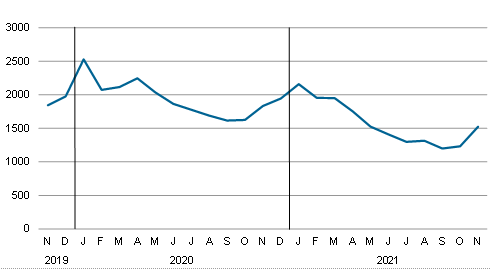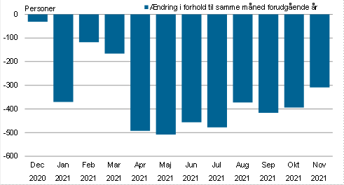 I november måned 2021 blev 1.524 personer i alt registreret som arbejdssøgende. Dette er et samlet fald på 309 arbejdssøgende personer i forhold til samme måned året før.