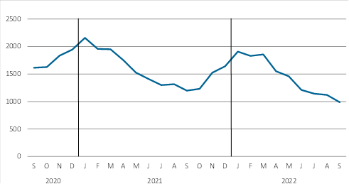 I september måned 2022 blev 987 personer i alt registreret som arbejdssøgende. Dette er et samlet fald på 212 arbejdssøgende personer i forhold til samme måned året før.