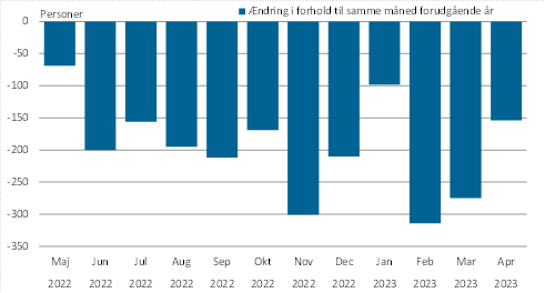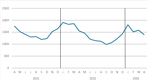 I april måned 2023 blev 1.397 personer i alt registreret som arbejdssøgende. Dette er et samlet fald på 154 arbejdssøgende personer i forhold til samme måned året før.