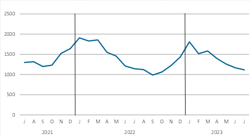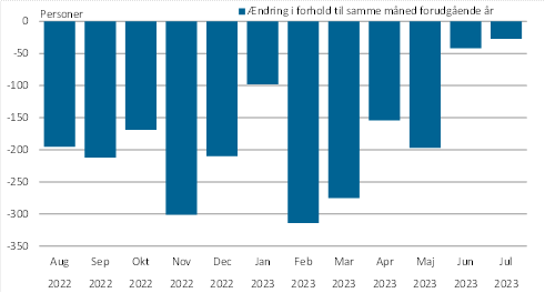 I juli måned 2023 blev 1.116 personer i alt registreret som arbejdssøgende. Dette er et samlet fald på 27 arbejdssøgende personer i forhold til samme måned året før.