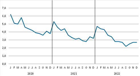 I 2022 var gennemsnitligt 931 personer registreret ledige hver måned. Det svarer til 3,2 pct. af den samlede arbejdsstyrke, jf. oversigt 1. Set i forhold til 2021 er den månedlige ledighed faldet med 128.