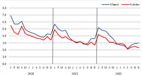 Overordnet set rammes flere mænd end kvinder af ledighed i løbet af en måned. I 2022 var der gennemsnitlig 525 ledige mænd hver måned mod 405 ledige kvinder. Således var gennemsnitligt 3,9 pct. af den mandlige arbejdsstyrke og 3,4 pct. af kvindelige arbejdsstyrke ledige hver måned i 2022.