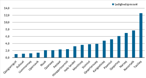 distrikt var ledighedsprocenten på 3,6 pct., hvilket lå tættest på landsgennemsnittet. I Nuuk distrikt var ledigheden på 2,1 pct.