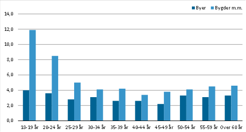 Mens ledigheden umiddelbart er størst i byerne, er ledighedsprocenten, der viser ledigheden ift. arbejdsstyrken, til gengæld størst i bygderne. I 2022 var gennemsnitligt 4,9 pct. af arbejdsstyrken i bygderne således ramt af ledighed hver måned, mens blot 3,0 pct. af arbejdsstyrken i byerne var ramt af ledighed.