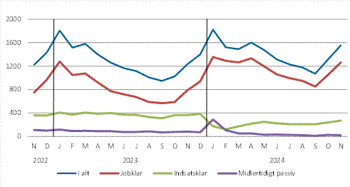 I november måned 2024 blev 1.554 personer i alt registreret som arbejdssøgende. Dette er en stigning på 320 arbejdssøgende personer i forhold til samme måned året før.