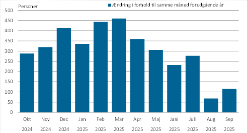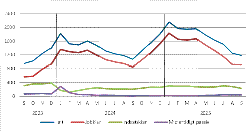 I september 2025 blev 1.186 personer i alt registreret som arbejdssøgende. Dette er en stigning på 115 arbejdssøgende personer i forhold til samme måned året før.