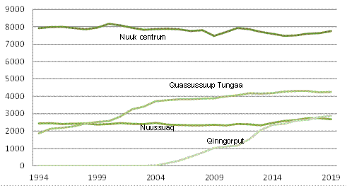 I både Kommuneqarfik Sermersooq, Qeqqata Kommunia og den nye Kommune Qeqartalik steg folketallet i 2018. Særlig kraftigt i Nuuk, hvor stigningen er opgjort til 188 personer. 32,1 pct. (17.984) af landets befolkning bor nu i Nuuk.