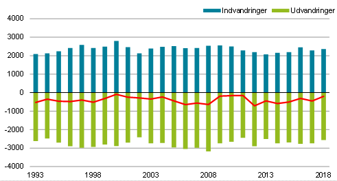 Figuren nedenfor viser udviklingen i vandringer i perioden 1993-2018. I gennemsnit har 395 flere personer flyttet fra Grønland end til, hvert år gennem hele perioden. I 2018 blev der foretaget 2.360 indvandringer og 2.560 udvandringer. Nettoudvandringen i 2018 blev derfor på 200 personer, en god del lavere end det gennemsnitlige årlige antal nettoudvandringer siden 1993.