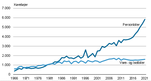 Den 1. januar 2021 var der 5.832 registrerede personbiler i Grønland. Det er en stigning på 8,4 pct. eller 453 personbiler i forhold til året før. Bestanden af vare- og lastbiler udgjorde 1.610 registrerede køretøjer pr. 1. januar 2021. Dermed steg antallet af vare- og lastbiler med 2,2 pct. i forhold til året før, jf. figur 1.