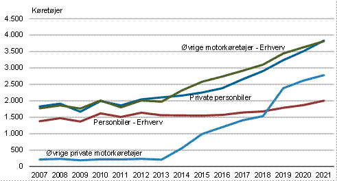 Anm.: Påhængsvogne indgår ikke i figuren. Øvrige private motorkøretøjer omfatter bl.a.. snescootere, hvor antallet af registreringer er steget markant siden 2014 som følge af de den pålagte nummerpladeregistrering i 2013.