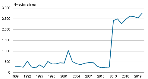 Anm. Det høje antal nyregistreringer i 2002 samt 2013-2020 er bekræftet af Grønlands Politi.