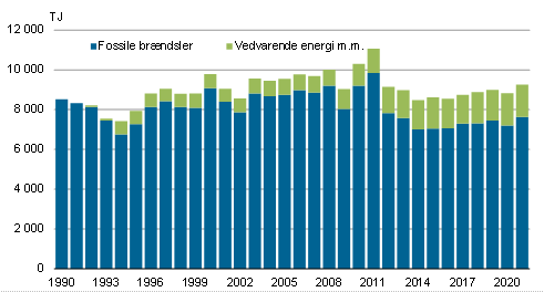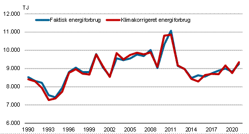 Det klimakorrigerede energiforbrug udgjorde 9.349 TJ i 2021. Det er 6,8 pct. mere end i 2020. I forhold til 1990 er det klimakorrigerede energiforbrug steget 8,6 pct.