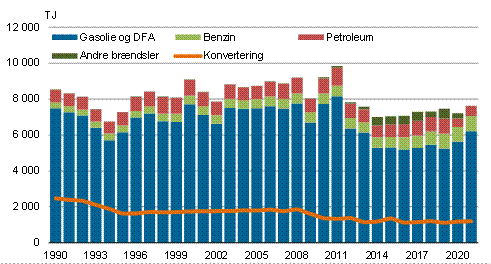 Gasolie er det mest benyttede brændsel. Produktet omfatter motorgasolie samt arktisk gasolie, der anvendes ved produktion af el og varme i konverteringssektoren, til opvarmning i husholdninger, institutioner og erhverv, i industrien samt til transport. Forbruget af gasolie steg med 10,5 pct. i 2021. Kurven i figur 4 viser den mængde gasolie og DFA, der anvendes i konverteringssektoren.