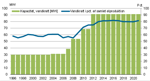 Siden 2012 har vandkraftkapaciteten ligget på 91,3 MW mod 68,8 MW i 2010 og 31,2 MW i 2005. Indtil 2005 var der kun et vandkraftværk i Buksefjorden, der indtil dets udvidelse i 2008 havde en kapacitet på 30 MW, jf. tabel 4.