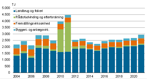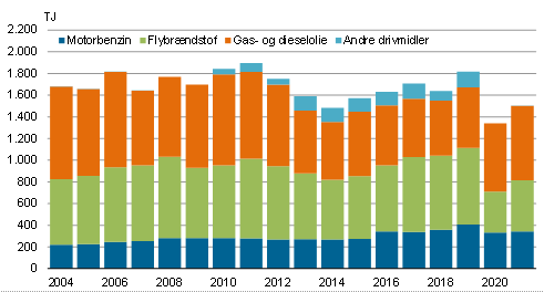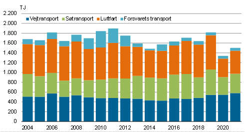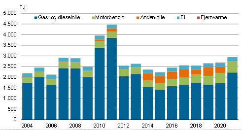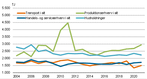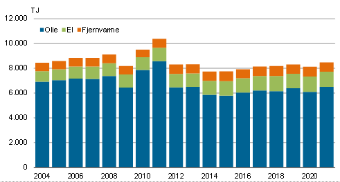 Der er sket betydelige ændringer i husholdningernes energiforbrug siden 2004. Olieforbruget er fortsat dominerende, men forbruget af olie har været gradvist faldende som følge af en overgang til el- og fjernvarme samt bedre isolerede boliger. Således er olieforbruget faldet fra 2.155 TJ i 2004 til 1.407 TJ i 2021 svarende til en reduktion på 34,7 pct.