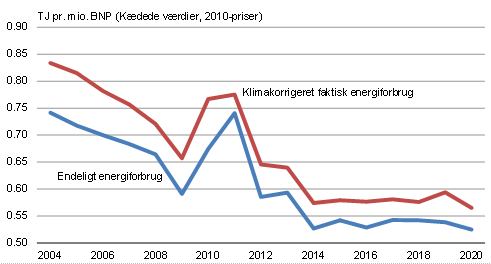 I forhold til 2004 er energiforbruget i engroshandel faldet med 20,3 pct., mens energiforbruget i detailhandel er vokset 27,5 pct. Energiforbruget i såvel privat som offentlig service er lavere i dag end i 2004.