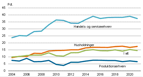Elforbruget har været generelt stigende inden for handels- og serviceerhverv dog med undtagelse af engroshandel. Fra 2004 til 2021 er elforbruget i engroshandel faldet 19,0 pct. I detailhandel er elforbruget imidlertid steget med 54,5 pct., mens forbruget i privat service er steget 44,0 pct. I offentlig service er elforbruget steget med 75,3 pct. siden 2004.