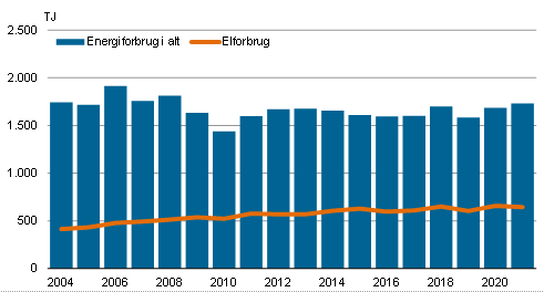 Elforbruget var på 645 TJ i 2021, hvilket er 2,0 pct. mindre end i 2020. I forhold til 2004 er elforbruget vokset 55,7 pct. Elforbruget omfatter også elvarme.