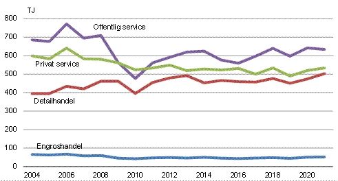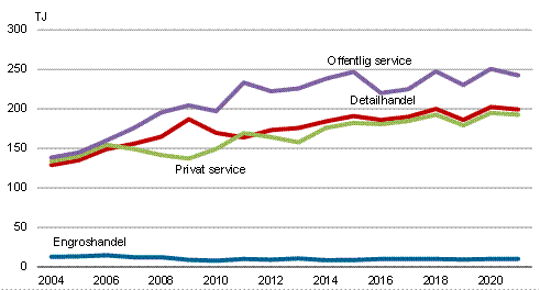 Fra 2020 til 2021 steg energiforbruget i privat service med 2,6 pct. I offentlig service faldt energiforbruget med 1,2 pct. I engroshandel og detailhandel steg energiforbruget med henholdsvis 2,8 pct. og 6,2 pct.