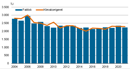 Husholdningernes klimakorrigerede energiforbrug udgjorde 2.293 TJ i 2021, hvilket var 0,2 pct. mindre end året før.