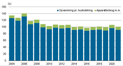 I 2021 var det gennemsnitlige energiforbrug pr. husholdning 101 GJ, hvilket er 5,0 pct. mindre end året før. Heraf blev 92 GJ – svarende til energiindholdet i knap 2.576 liter gasolie – anvendt til rumopvarmning og opvarmning af brugsvand. I forhold til 2004 er energiforbruget pr. husholdning faldet 24,8 pct.