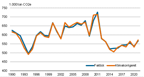 De klimakorrigerede emissioner fra energiforbrug steg 7,4 pct. i 2021 i forhold til året før. Sammenlignet med 1990 har der været et fald på 7,3 pct.