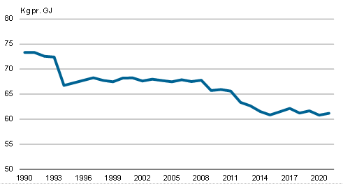 Ændringen i energiforbrugets brændselssammensætning dvs. skiftet fra fossile brændsler til vedvarende energi har betydet, at der udledes stadig mindre drivhusgas pr. forbrugt enhed brændsel. I 2021 var der til hver GJ faktisk energiforbrug knyttet 61,2 kg drivhusgasser mod 73,3 kg. i 1990. Det svarer til en reduktion på 16,5 pct. Emissionen af drivhusgas pr. forbrugt enhed brændsel steg i 2021 i forhold til året før pga. et større forbrug af gasolie, der oversteg stigningen forbruget af energi fra vandkraft, jf. figur 39.