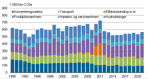 I 2021 udgjorde den samlede faktiske emission af drivhusgasser fra energiforbrug 566.518 ton CO2-ækvivalent. Heraf kom 97.874 ton fra konverteringssektoren, 109.276 ton fra transport, 57.040 ton fra handels- og serviceerhverv, 103.176 ton fra husholdninger, 192.640 ton fra produktionserhverv samt 6.512 ton fra råstofudvinding og efterforskning, hvor sidstnævnte er uddraget fra produktionserhverv for at illustrere emissionen af drivhusgasser i 2010 og 2011 under olieefterforskningen.