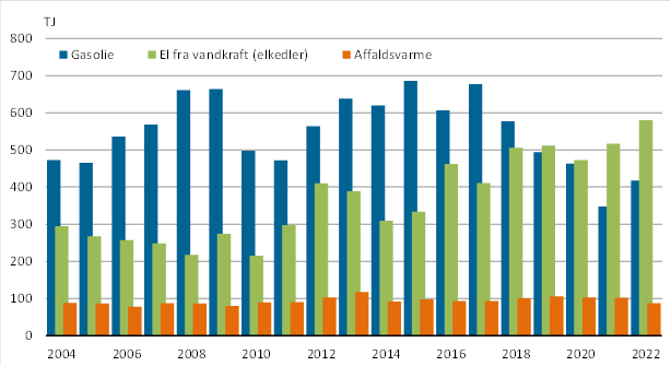 En fordeling af fjernvarmeproduktionen på brændsler viser, at 418 TJ i 2022 svarende til 38,5 pct. blev produceret på varme- og kraftvarmeværker ved forbrænding af gasolie. Forbrænding af affald på forbrændingsanlæggene bidrog med 88 TJ svarende til 8,1 pct. af den samlede fjernvarmeproduktion. Endelig tegnede den vandkraftbaserede fjernvarme sig for 53,4 pct. af produktionen. Den vandkraftbaserede produktion var på 580 TJ i 2022, hvilket er 12,2 pct. mere end i 2021.
