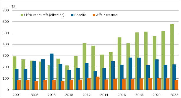Anm.: Produktion af fjernvarme består af en oliebaseret produktion på varme- og kraftvarmeværker, restvarme fra elværker, affaldsvarme fra forbrændingsanlæg samt en vandkraftbaseret fjernvarme produceret på elektrokedler. Som følge af manglende oplysninger fra Nukissiorfiit vedr. produktion af vandkraftbaseret fjernvarme i 2004-2008 er den vandkraftbaserede fjernvarmeproduktion i disse år estimeret ud fra den kendte afsatte mængde af vandkraftbaseret fjernvarme tillagt et tab på 16-18 pct. svarende til tabet i perioden 2009-2013.