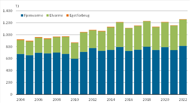 Fjernvarme er varmt vand, der distribueres via et højisoleret rørsystem. Produktionen af fjernvarme sker på et varmeværk, kraftvarmeværk eller forbrændingsanlæg. Den samlede fjernvarmeproduktion er opgjort til 1.085 TJ i 2022. Det er en stigning på 12,3 pct. i forhold til 2021. I forhold til 2004 er produktionen af fjernvarme steget 26,8 pct.