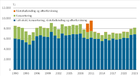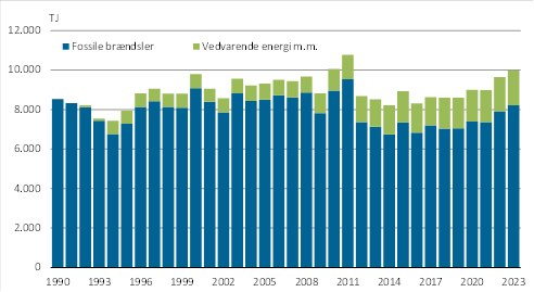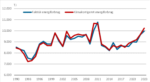 Det klimakorrigerede energiforbrug udgjorde 10.232 TJ i 2023. Det er 5,8 pct. mere end i 2022. I forhold til 1990 er det klimakorrigerede energiforbrug steget 17 pct.