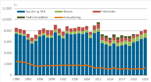 Gasolie er det mest benyttede brændsel. Produktet omfatter motorgasolie samt arktisk gasolie, der anvendes ved produktion af el og varme, til opvarmning i husholdninger, institutioner og erhverv, i industrien samt til transport. Forbruget af gasolie steg med 3,4 pct. i 2023. Kurven i figur 4 viser den mængde gasolie og DFA, der anvendes i konverteringssektoren.