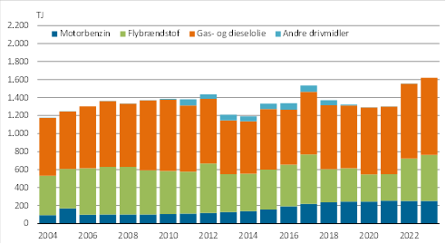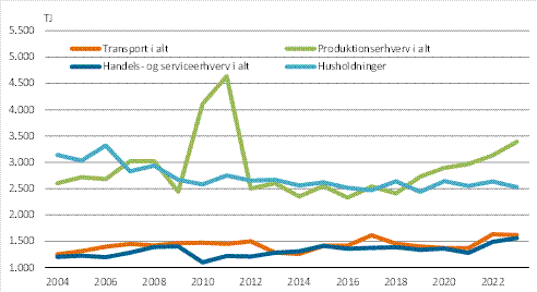 I 2023 steg produktionserhvervenes energiforbrug med 9,5 pct. for gas- og dieselolie. Elforbruget steg med 1,6 pct. Forbruget af gas- og dieselolie er dominerende med en andel på 74 pct. af det samlede energiforbrug i 2023. Forbruget af gas- og dieselolie er steget 22,1 pct. siden 2004. I samme periode er forbruget af el steget 58,8 pct.