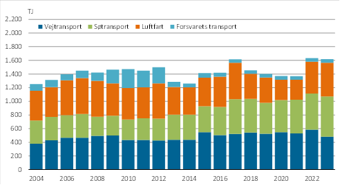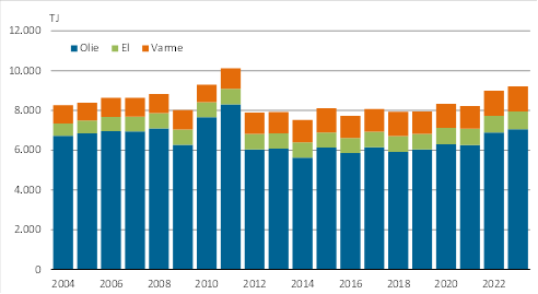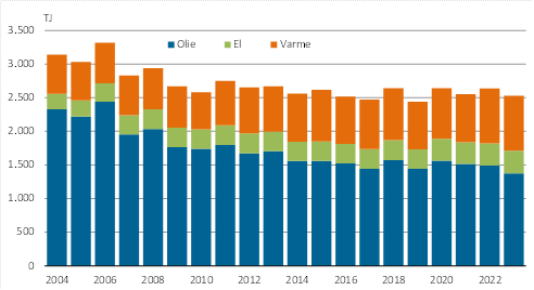 Der er sket betydelige ændringer i husholdningernes energiforbrug siden 2004. Olieforbruget er fortsat dominerende, men forbruget af olie har været gradvist faldende som følge af en overgang til el- og fjernvarme samt bedre isolerede boliger. Således er olieforbruget faldet fra 2.328 TJ i 2004 til 1.375 TJ i 2023 svarende til en reduktion på 40,9 pct.