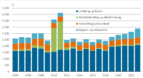 I 2023 udgjorde energiforbruget til landbrug og fiskeri 2.094 TJ, hvilket er en stigning på 3,5 pct. i forhold til 2022. Energiforbruget til fremstillingsvirksomheder udgjorde 489 TJ, - en lille stigning på 0,3 pct. i forhold til året før. Byggeri- og anlægsvirksomhed anvendte 693 TJ, hvilket er 24,8 pct. mere end i 2022. Endelig steg energiforbruget til råstofudvinding og efterforskning med 69,5 pct. fra 67 TJ i 2022 til 114 TJ i 2023. Bemærk det store energiforbrug til råstofudvinding og efterforskning i 2010 og 2011 pga. de førnævnte olieefterforskningsboringer.