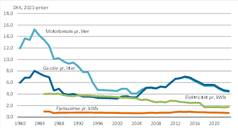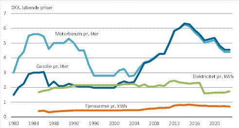 I 2023 var den gennemsnitlige forbrugerpris på 1 liter motorbenzin 4,40 kr. Prisen var uændret ift. 2022. Forbrugerprisen på 1 liter gasolie var ligeledes uændret på 4,55 kr. Siden indførslen af en miljøafgift på energiprodukter pr. 1. januar 2011 har afgiften på såvel motorbenzin som gasolie udgjort 0,10 kr. pr. liter.