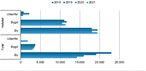 Figur 2. Indhandling i ton fordelt på art og by/bygd/udenfor1