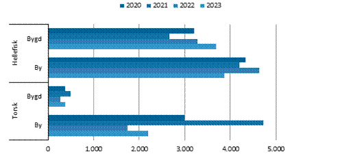 Figur 2. Indhandling i ton fordelt på art og by/bygd