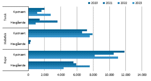 Figur 3. Indhandling i ton fordelt på arter i kystnært og havgående segment