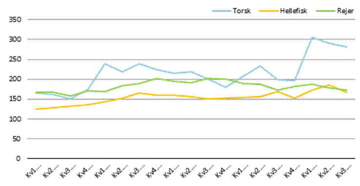Prisindeks for rejer, hellefisk og torsk i 3. kvartal