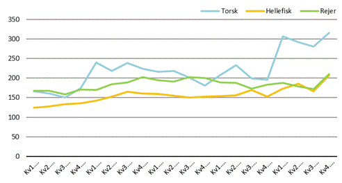 Prisindeks for rejer, hellefisk og torsk (2010=100)