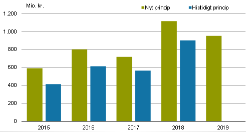 Figuren viser, at eksportværdien er ca. 30 pct. højere i hvert af årene på baggrund af det nye indberetningsprincip. Derfor kan eksportværdien for 2019 ikke umiddelbart sammenlignes med tidligere års eksportværdier.