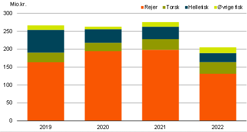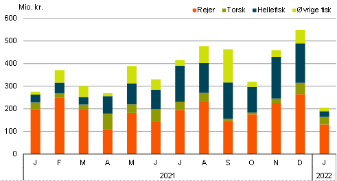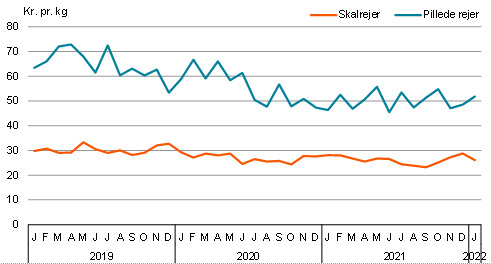 Eksportværdien af rejer er i januar 2022 faldet med 33,9 pct. i forhold til samme måned sidste år. Det svarer til et fald 67 mio. kr. Mængderne faldt med 26 pct. og priserne faldt med 10,7 pct.