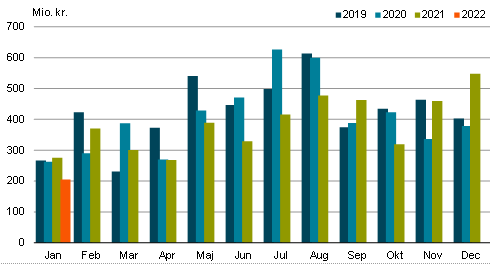 Eksportværdien i januar 2022 var på 205 mio. kr. I forhold til sidste år samme periode, er der tale om et fald på 70 mio. kr., svarende til 25,5 pct. Det skal dog understreges, at tallene endnu er foreløbige tal og skal derfor fortolkes med varsomhed.